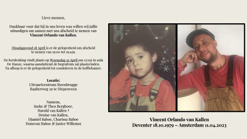 Rust zacht lieve Vincent familie van Kallen gecondoleerd en heel veel sterkte namens Richel Koorndijk en familie.